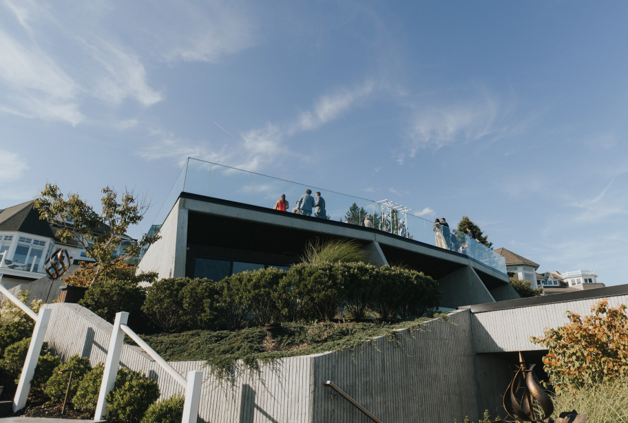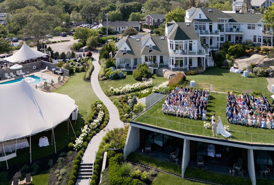 Completely unobstructed aerial views of Nubble Lighthouse, the infinity lawn is the viewpoint. Purpose-built, and Maine's first commercial grass roof building, this space takes its name from the infinity glass railing which creates a "cliff" effect — peering directly out onto the Atlantic Ocean.